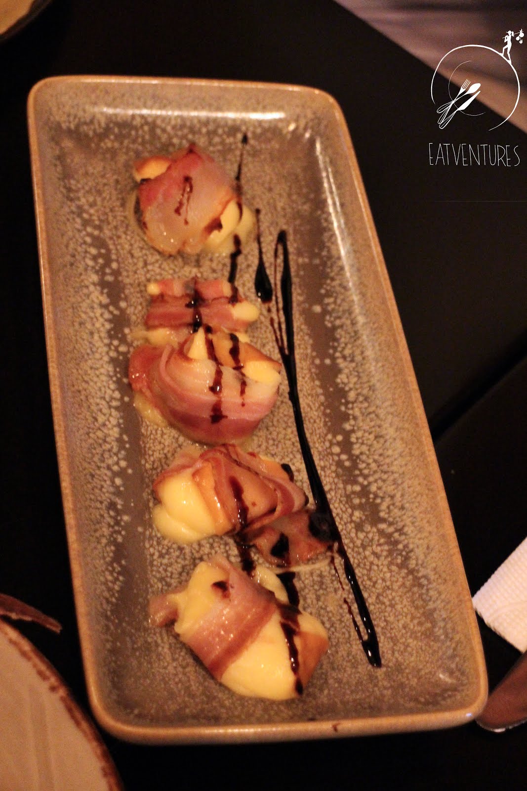 | Scamorza Affumicata - Baked Smoked Fior Di Latte wrapped in Pancetta, drizzled with balsamic glaze |